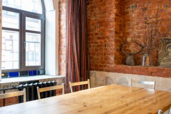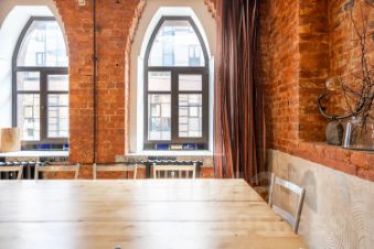 Натуральный кирпич, высокие потолки, большие арочные окна и дизайнерский свет создают атмосферу стильного арт-пространства.