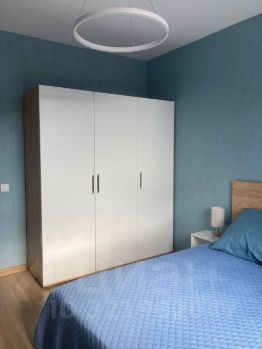 Спальня - двухспальная кровать, телевизор и вместительный шкаф для хранения.