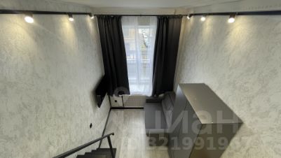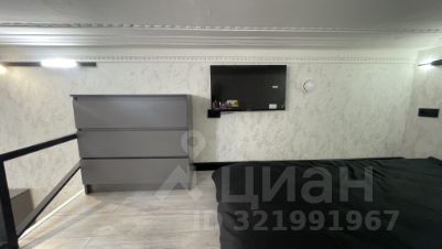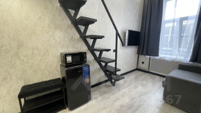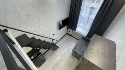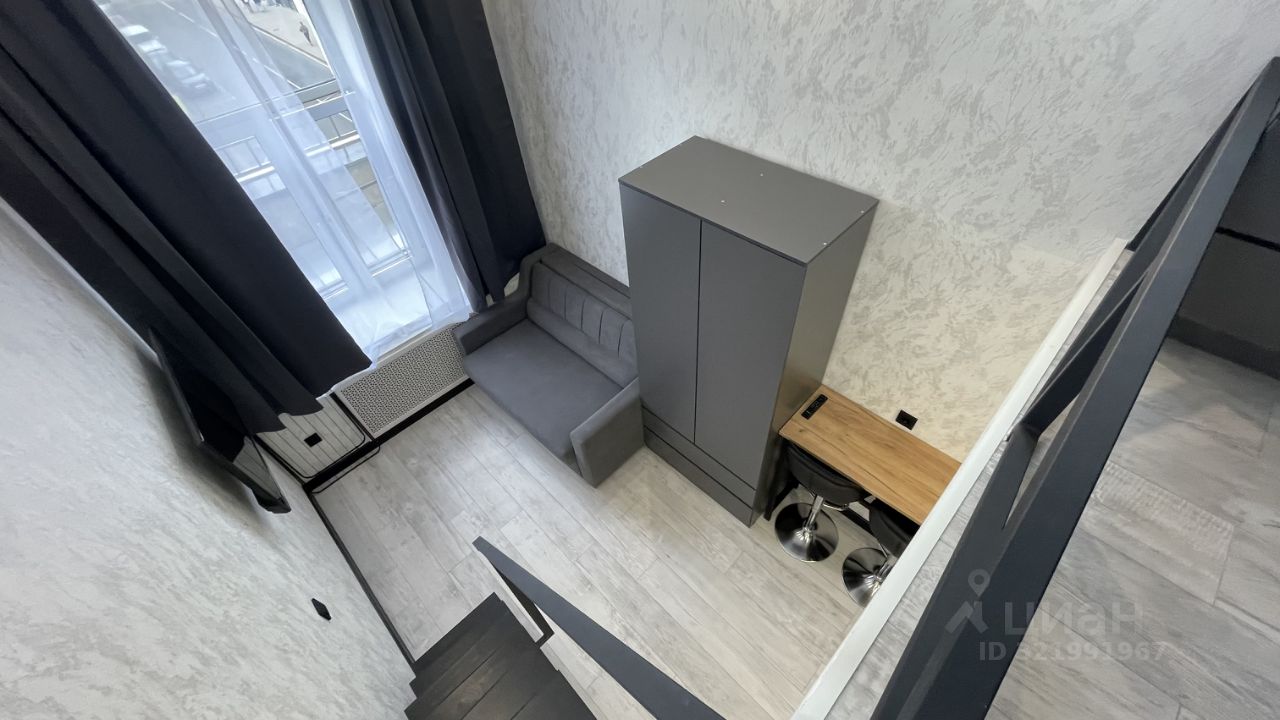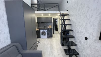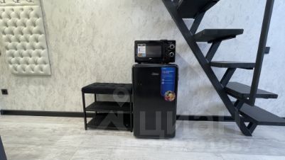 Имеется вся необходимая мебель и техника: на втором уровне - большой ортопедический матрас, телевизор с smart-tv и тумба для хранения вещей. Внизу расположен санузел, гостиная и кухня. В гостиной так же есть телевизор, удобный диван и обеденный столик. Мини-кухня оснащена варочной панелью, холодильником и микроволновой печью. В студии есть необходимый набор посуды для быстрого приготовления и приема пищи. Здесь достаточно много места для хранения вещей и чемоданов. Окна студии выходят на улицу на балкон. В студии располагается индивидуальный санузел с душем. Душ так же очень удобно организован, есть фен, сушилка для полотенец, полочки для хранения косметики и большое зеркало.