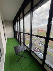 Огромная лоджия 9 метров с панорамными окнами — шикарный вид на город, можно хорошо отдохнуть после насыщенного дня.