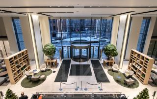 Есть наземная парковка и подземная, спортзал, фуд корт, рестораны, салон красоты, массаж, химчистка, услуги консьерж и уборки.