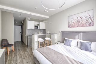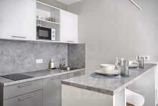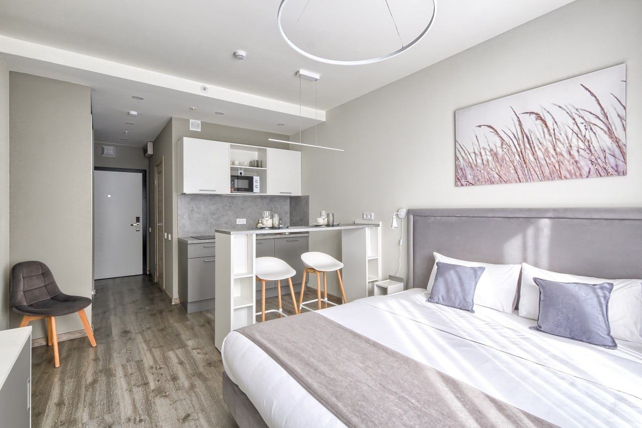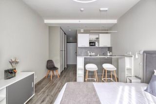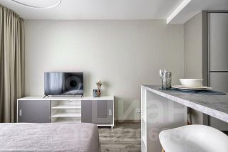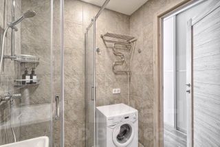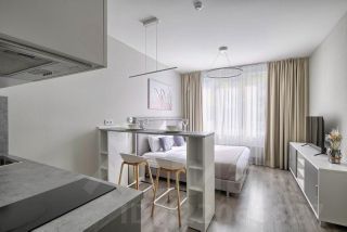 В студии продумано всё до мелочей: удобная и функциональная мебель на кухне и в комнате, современная техника — кондиционер, холодильник, телевизор и стиральная машина. Ванная комната оборудована душевой кабиной, что добавляет уюта и комфорта.