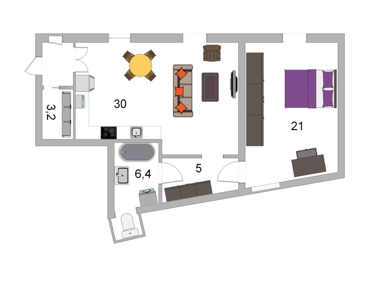 В квартире расположена кухня-гостиная 30 кв.м., спальня с зоной кабинета 21,1 кв.м., просторный совмещенный санузел, вместительная гардеробная.