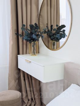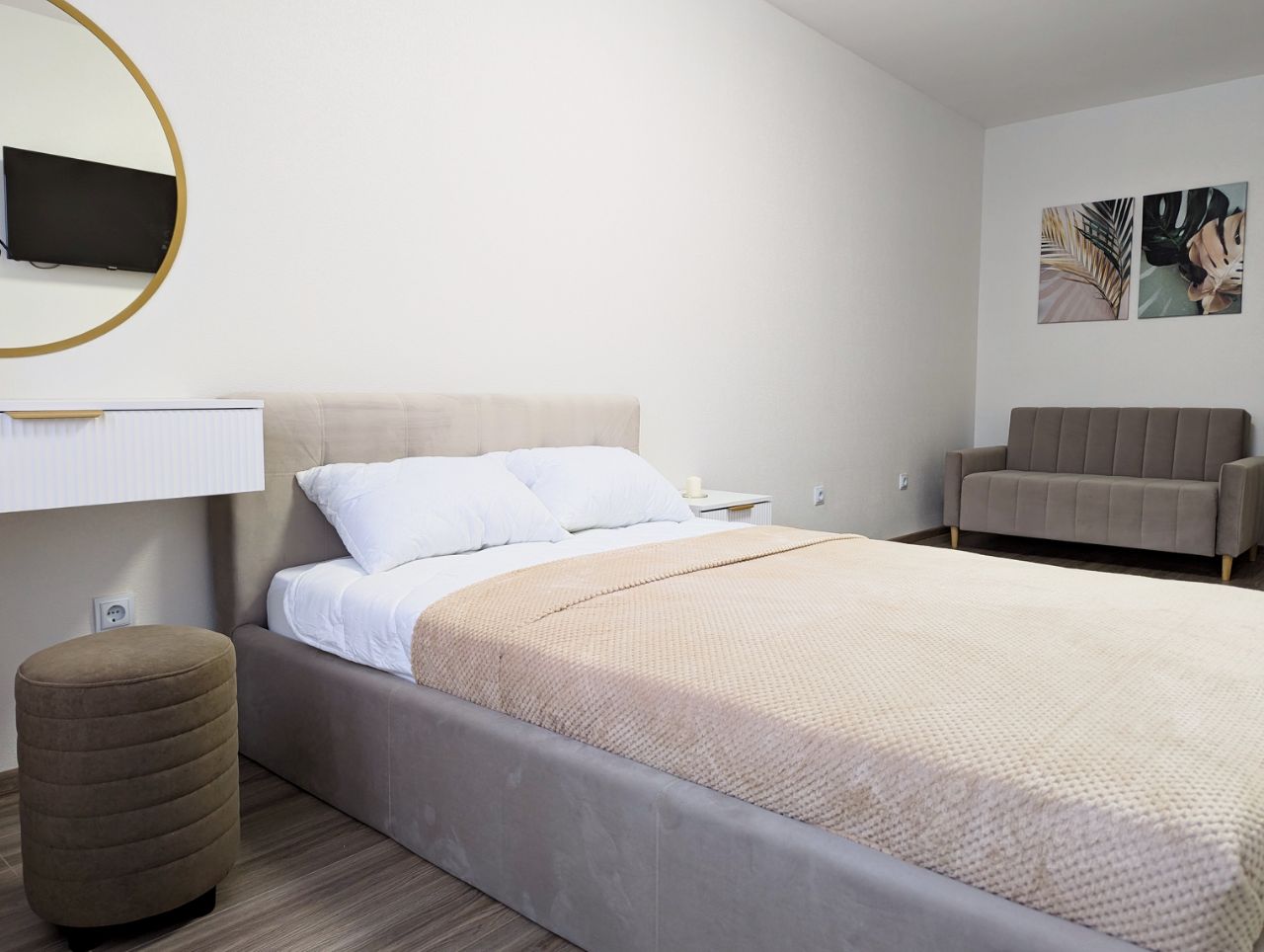 В спальне - просторная двух спальная кровать, очаровательная консоль, телевизор и комфортный раскладной диван.
