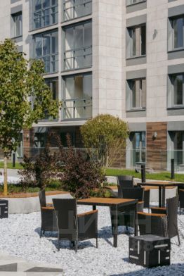 Во дворе комплекса благоустроенная территория с детскими площадками, набережная где вы можете отдохнуть в уютных беседках, на шезлонгах, не выходя из комплекса.