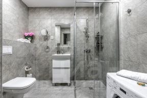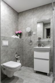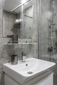 Ванная комната с душевой , комплектом полотенец и косметических принадлежностей .
