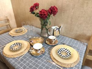 необходимая посуда и электроприборы: телевизор, чайник, холодильник, фен, стиральная машина, утюг и гладильные принадлежности; свежее постельное бельё и полотенца; принадлежности для душа.