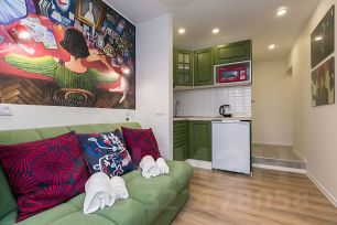 Студия оснащена удобным диваном, который раскладывается в ровную кровать, на которой с комфортом разместятся двое взрослых.