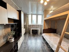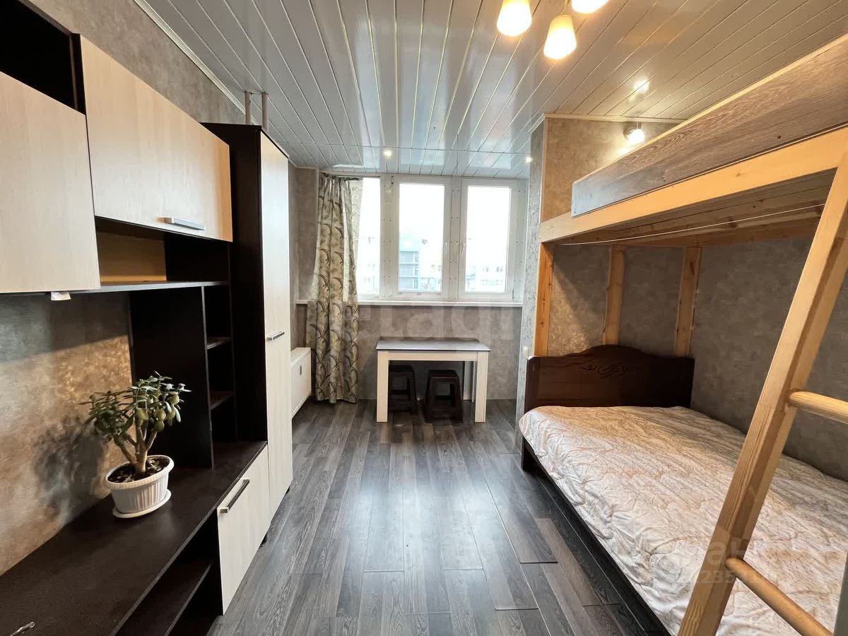 • Просторная жилая комната, оборудованная столом, двухъярусной кроватью и стенкой под телевизор, создающая атмосферу уюта и функциональности.