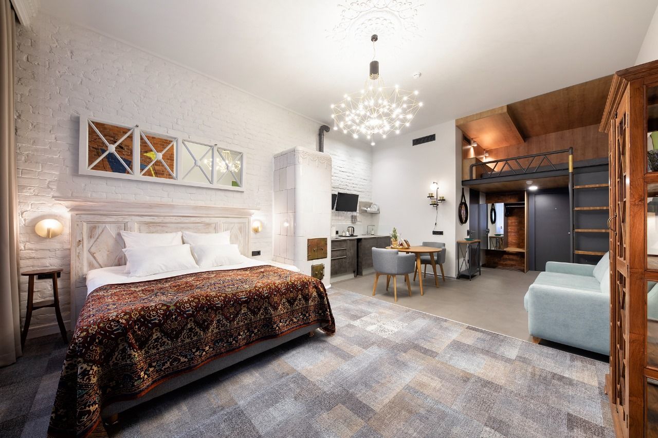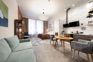 Стильный, просторный и светлый апартамент класса Deluxe для ценителей максимального комфорта, изюминкой которого является старинный камин 1912 года с оригинальными изразцами и ванная комната с глухим окном.