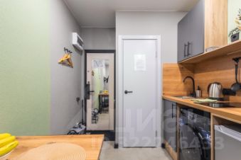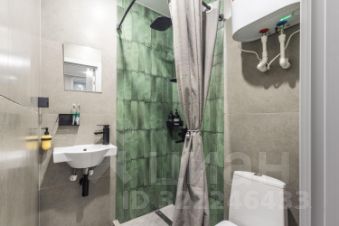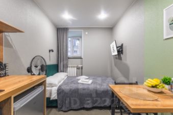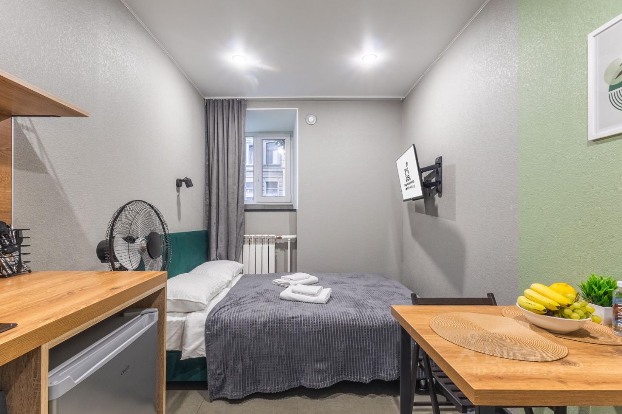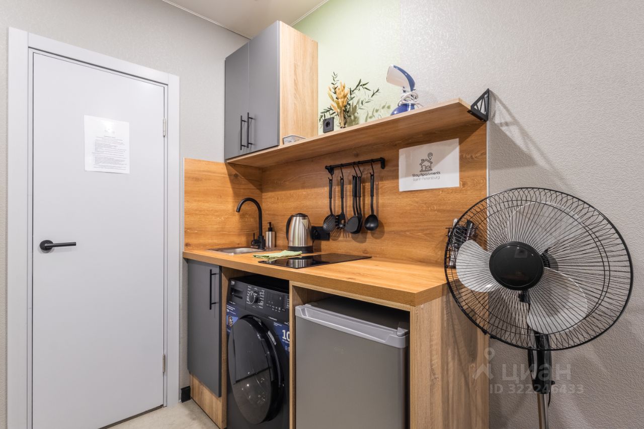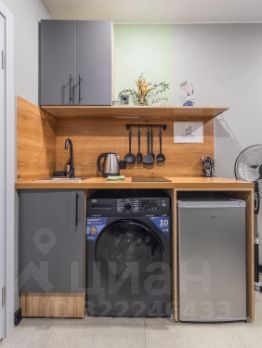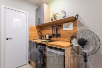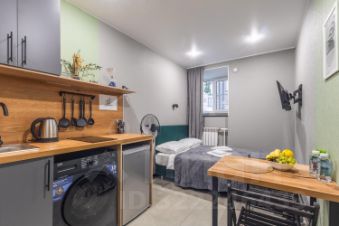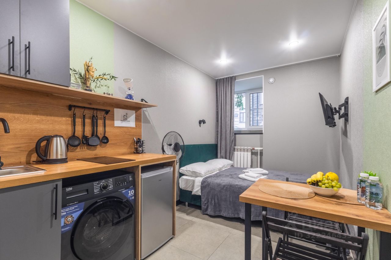 Студия оснащена полноценным санузлом, небольшой кухонной зоной, всей необходимой техникой и мебелью: