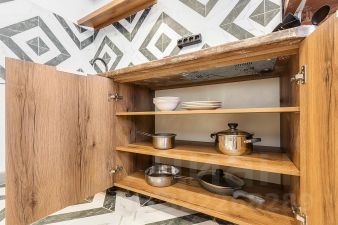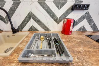 -Полностью оборудованный кухонный гарнитур с электрическим чайником, микроволновой печью и всей необходимой посудой, обеденный стол и стулья;