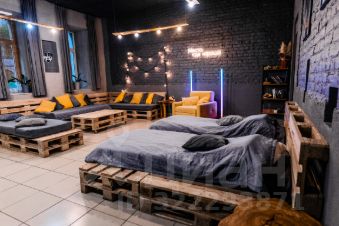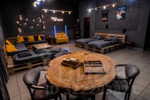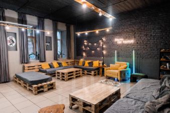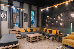 Пространство трансформируется под задачи: для проживания из палет будут кровати, для вечеринок - диваны со столами. На фото представлены обе конфигурации мебели.