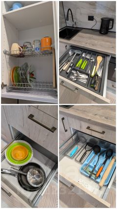 Индукционная плита, холодильник, духовка, вытяжка, микроволновка, чайник, кровать с матрасом 140*200 см с независимым пружинным блоком, ручной пылесос, утюг, кухонная утварь, стиральная машина, вместительный шкаф, шторы blackout.