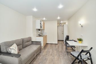 - Оборудованная мини-кухня с индукционной варочной поверхностью, холодильником, микроволновой печью, чайник, вся необходимая посуда и кухонные принадлежности