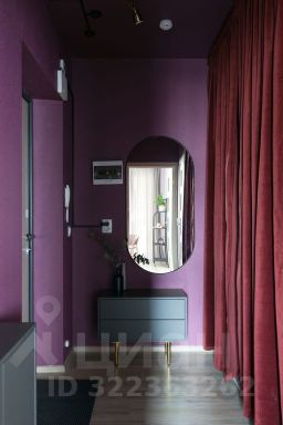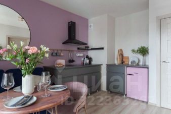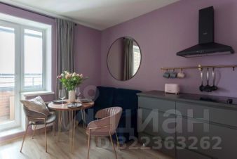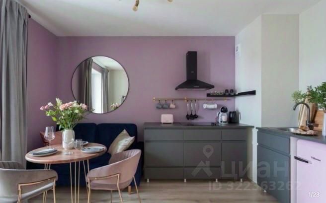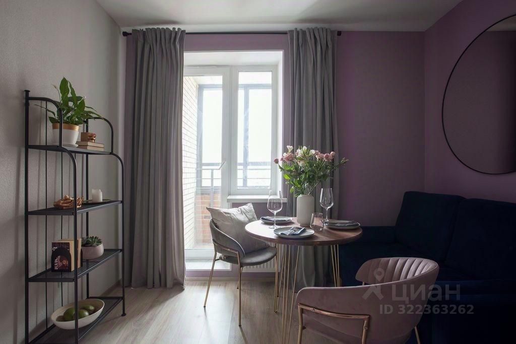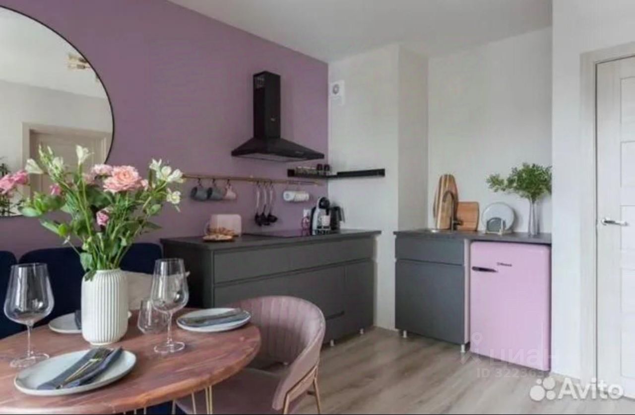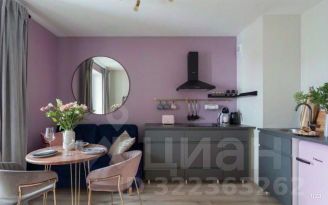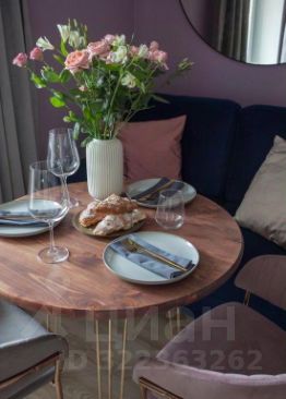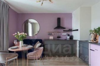 Кухня-гостиная с круглым столом и бархатным диваном.
