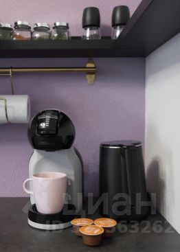 комфортная рабочая зона с варочной панелью, кофе-машиной, тостером, холодильником и микроволновой печью.