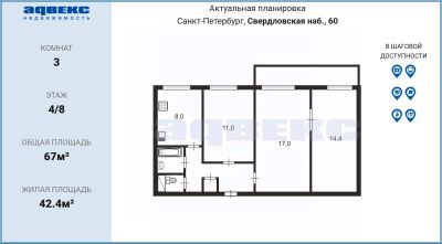 Квартира с незабываемым видом на изящный изгиб Невы и на белокаменный Смольный собор сдаётся впервые. Все 4 окна с балконом выходят на набережную Невы. Сам микрорайон красивый и достаточно зелёный: в непосредственной близости Полюстровский парк, сад Нева, есть несколько скверов с прудами. Хочется отметить, что обеспечен удобный выезд в Центральный район и на КАД.