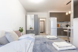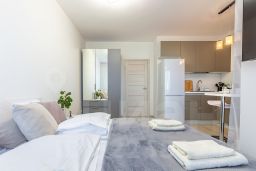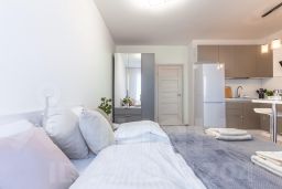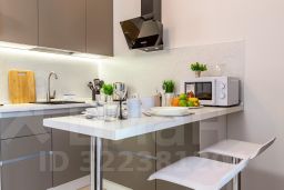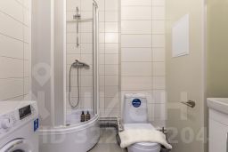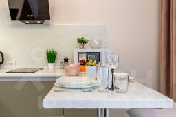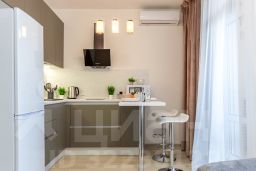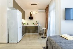 В студии выполнен евроремонт, есть вся необходимая мебель как в комнате, так и на кухне. Из техники имеются кондиционер, холодильник, телевизор и стиральная машина, микроволновая печь, утюг, фен, и др. Санузел совмещённый, оборудован душевой кабиной. Есть лоджия, окна выходят на улицу, что позволяет наслаждаться городским видом.