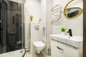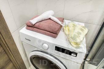 -Санузел с душевой кабиной и туалетом, а также стиральной машинкой.Также есть утюг и фен.