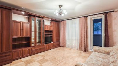 В первой жилой комнате установлена стенка с подсветкой, телевизор, есть большая тумба и зеркало, а также диван-кровать. Выход на большой застеклённый балкон - отсюда.