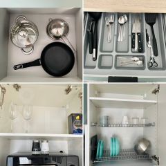 Кухня со всем необходимым (холодильник, варочная панель, духовой шкаф, чайник, микроволновая печь, а так же посуда, приборы )