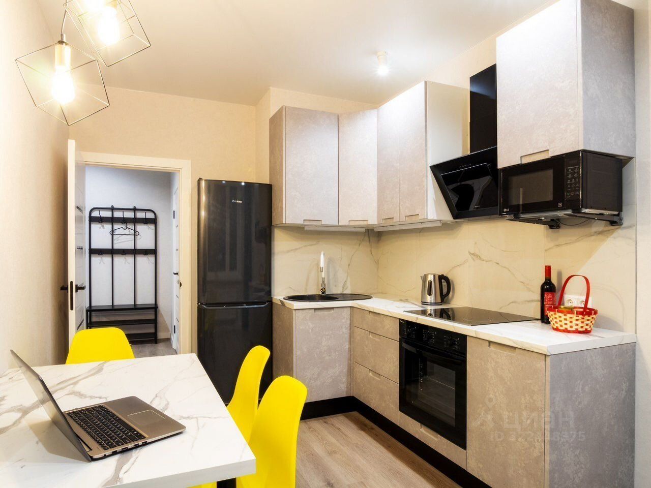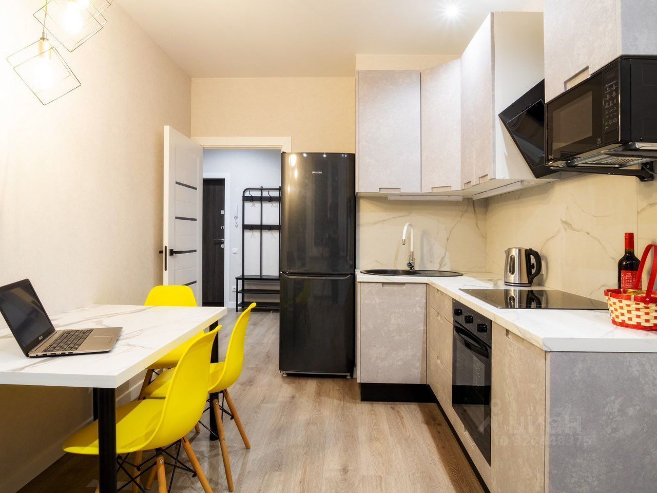 Кухня-гостиная: кухонный гарнитур со встроенной техникой (духовка, варочная панель, посудомоечная машинка), обеденный стол, стулья, диван-кровать(на фото его еще нет), тв.