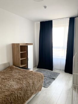 Квартира с полным набором мебели - два раскладывающихся дивана, посуда, стол, стулья, стиральная машина, холодильник, микроволновая печь, шкаф. Два санузла.