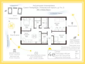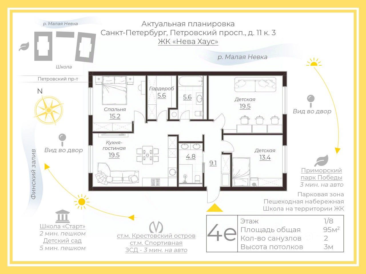 3 спальни 15.2 + 13.4 + 19.5 кв.м.