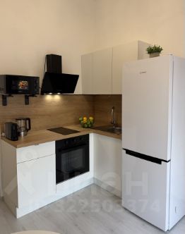 Кухня со всем необходимым (кофемашина, холодильник, варочная панель, духовка, вытяжка, микроволновая печь, чайник, а так же посуда, приборы )