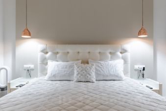 Просторная спальня (16м2), большая двуспальная кровать 180х200 см с ортопедическим матрасом Askona (режимы трансформации: просмотр ТВ, невесомость, массаж и др.) с подсветкой на пульте управления с разными режимами подсветки, с большим шкафом для хранения, напольным кондиционером.