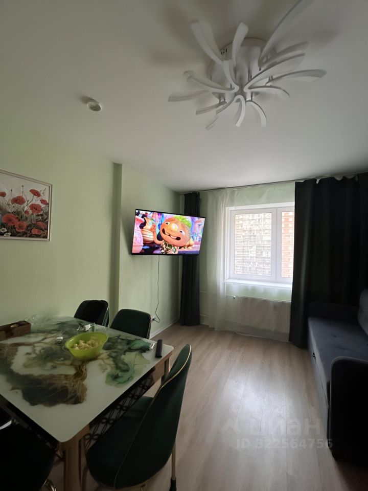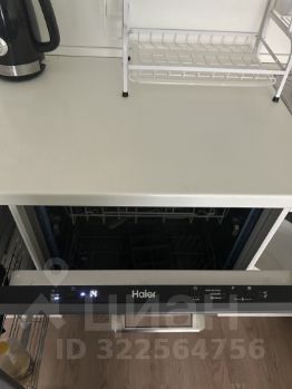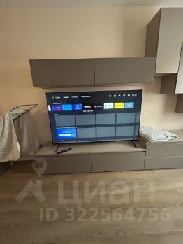 Кухня-гостиная: Большая кухня с современной бытовой техникой, включая холодильник, варочную поверхность, духовой шкаф и чайник. Здесь также есть раскладной диван и второй Smart TV, что делает пространство многофункциональным.