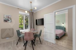 В квартире сделан дизайнерский ремонт. Вся мебель, посуда, сантехника, постельное белье совершенно новые. В квартире 2 отдельные полноценные спальни с кроватями размера king-size, в гостиной раскладной двуспальный диван.