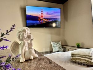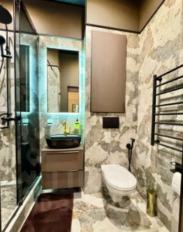 В студии просторная прихожая, современный сан. узел с душевой кабиной, зеркалом с подсветкой и всеми гигиеническими средствами.