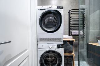 В ванной комнате: туалет, душ, стиральная машина, сушильная машина, фен, утюг, набор гигиенических средств, тапочки, полотенца для ног, рук и тела на каждого гостя.