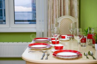 * Обеденная группа: раздвижной стол и четыре массивных стула.