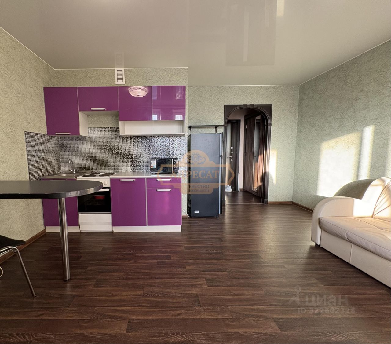 установлен кухонный гарнитур, есть диван и барная стойка, холодильник, стиральная машинка, большой шкаф в коридоре.