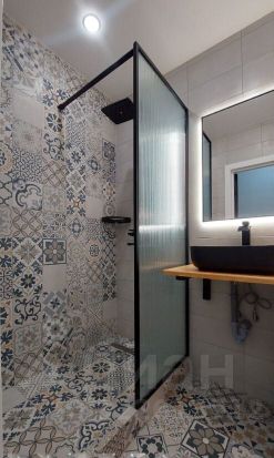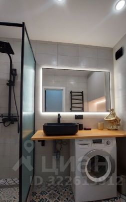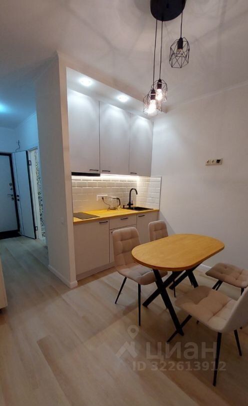 Интерьер выполнен в светлых тонах с акцентами, тёплый оттенок пола и современное освещение создают атмосферу уюта.