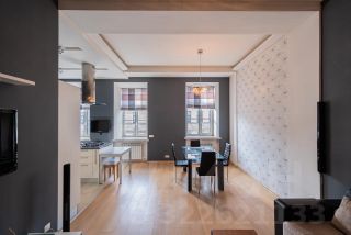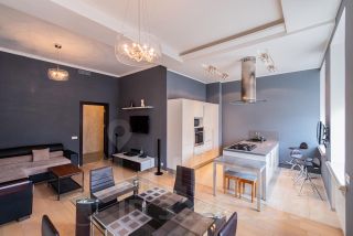 В квартире сделан дизайнерский ремонт, который создаёт уютную атмосферу. В квартире имеется вся необходимая мебель для комфортного проживания. Кухня площадью 15 кв. м оборудована современной техникой: холодильником, посудомоечной машиной, стиральной машиной и телевизором.