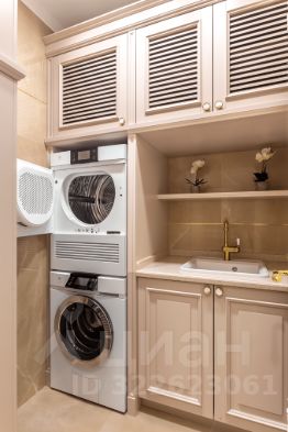 Планировка квартиры включает в себя кухню со столовой зоной, гостиную с домашним кинотеатром, мастер-спальню, детскую мастер-спальню, гостевой санузел и постирочную. В квартире установлено скрытое кондиционирование.