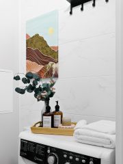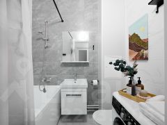 ванная комната со средствами личной гигиены (шампунь, гель для душа, жидкое мыло, туалетная бумага, стиральный порошок)