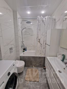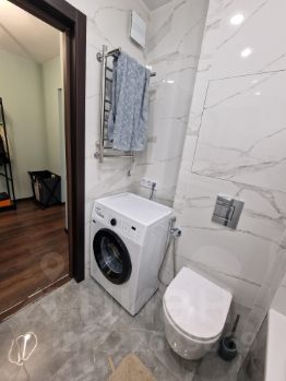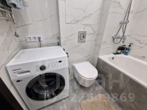 Современный санузел отделан широкоформатным керамогранитом, инсталляция с гигиеническим душем, широкая, комфортная ванная с тропическим душем.