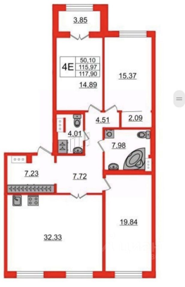 - Два санузла: отдельная ванная и душевая кабина — максимум удобства для всех жильцов