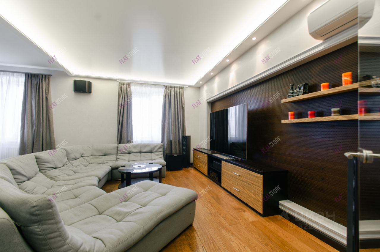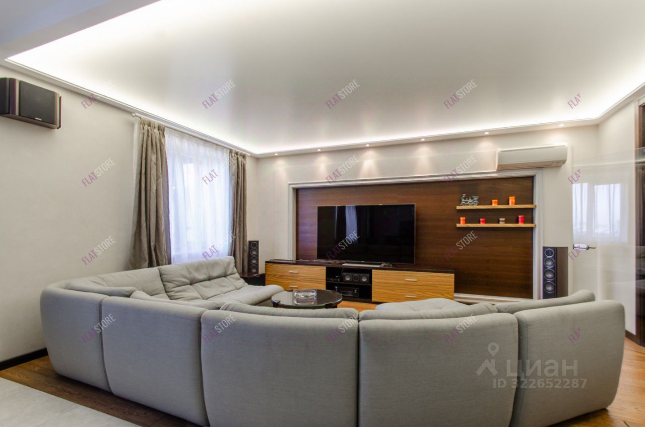 В гостиной большой удобный диван, телевизор и аудиосистема домашнего кинотеатра.