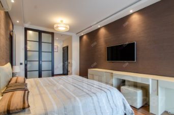 Состоит из кухни-гостиной и трех изолированных спален. В каждой спальне гардеробное пространство.