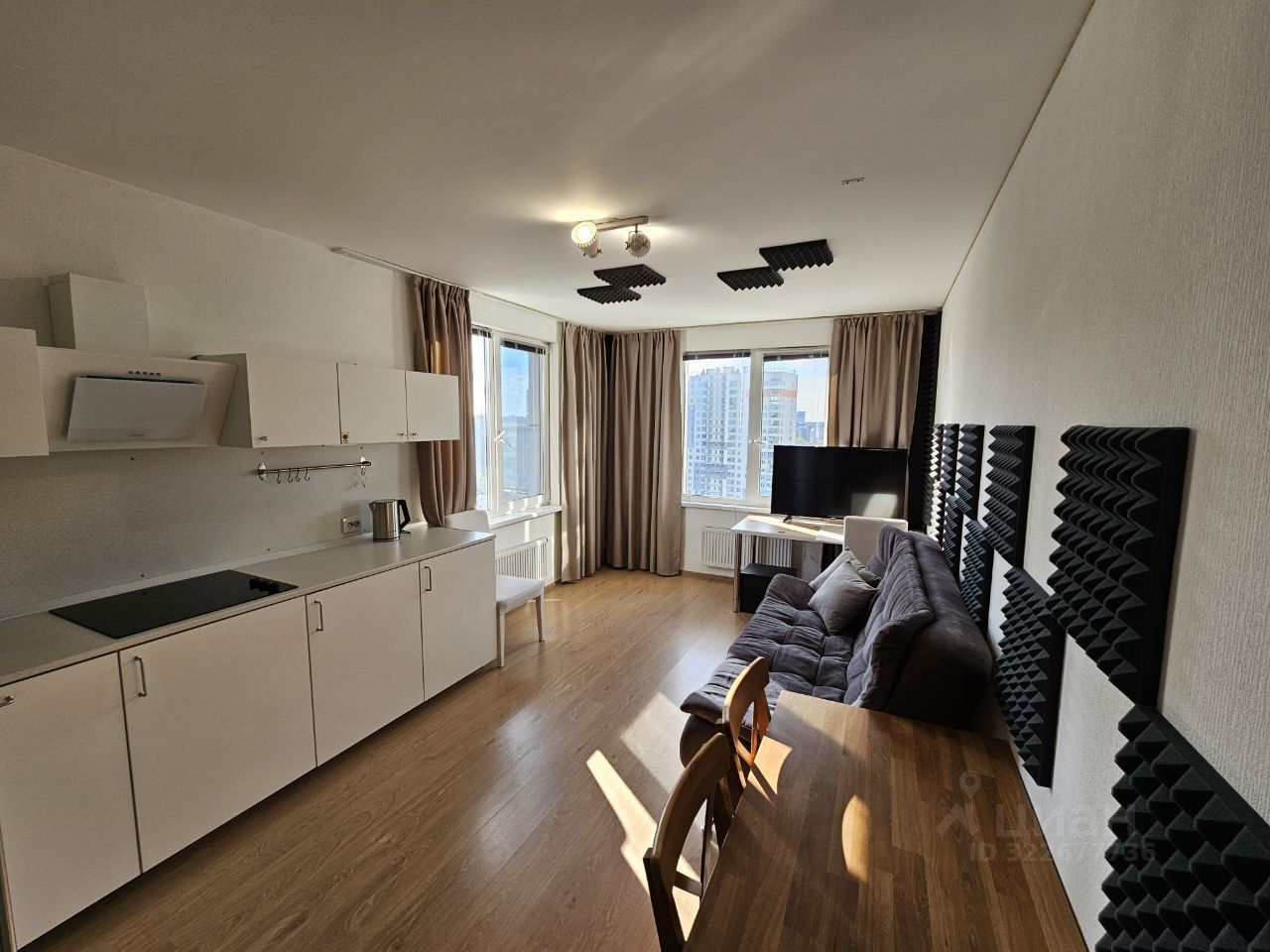 Есть интернет, телевизор, холодильник, микроволновка, чайник, посудомоечная машина, стиралка, утюг, фен, вся необходимая посуда. Питьевая вода очищается фильтром. На кухне-гостиной на стенах поклеен акустический поролон для уменьшения эха и лучшей звукоизоляции.