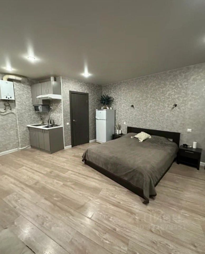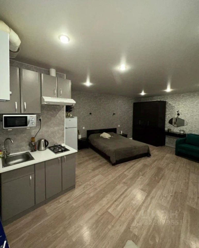 В квартире сделан свежий евроремонт. Оборудована всеми необходимыми для комфортного проживания мебелью и техникой: есть холодильник, телевизор, стиральная машина, посуда. Планировка студии предусматривает объединённую жилую зону и кухню. Окна выходят во двор, поэтому в квартире всегда тихо и спокойно.