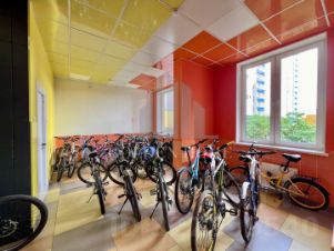 В доме скоростные лифты, на первом этаже - охраняемая площадка для колясок и велосипедов, душевая для животных.
