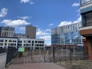 Компактный дом на 3 парадные, закрытый двор, концепция двор без машин, установлены стойки для парковки велосипедов, вход в парадную без ступеней, стеклянная входная зона, два лифта, и пассажирский и грузовой, всего 13 этажей, нет проблем с очередями в лифт, чистая и светлая лестница. Все квартиры сдавались уже с ремонтом, поэтому в доме тихо.