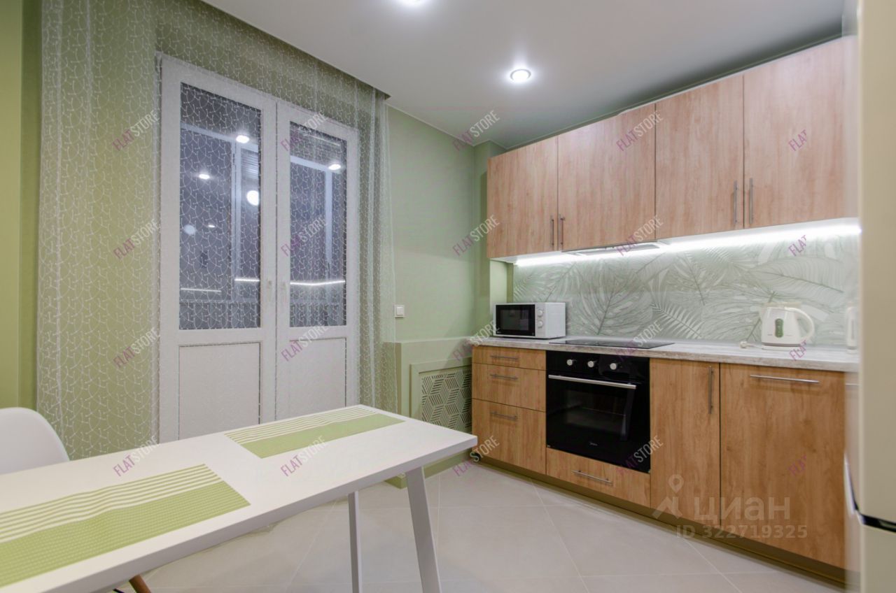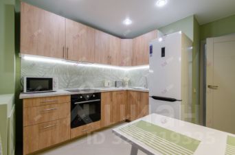 Установлена встроенная кухня с духовым шкафом, холодильником, вытяжкой, посудомоечной машиной. По контуру кухонной зоны есть подсветка.